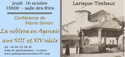 Pour cette première conférence automnale, le jeudi 16 octobre à 15h00 dans la salle des fêtes l’association Patrimoine et Culture invite Pierre Simon, Historien médiéviste, secrétaire général de la société académique d’Agen dont le thème sera « La noblesse en Agenais aux XIII et XIV siècles »